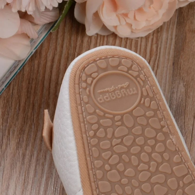 Designed with trendy leather and a soft rubber sole, these infant moccasins offer the utmost protection against rough surfaces and floors, ensuring your baby's delicate feet are always safe. The slight padding on the bottom provides a cozy cushioning for those tiny steps.